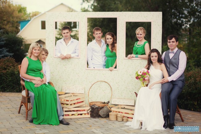 Практически все было сделано золотыми руками нашего декоратора Кристины Пантелеевой. Собственноручно выкрашенный велосипед и лопаты (для love-story), а также лейки, которые заменили стандартные вазы для цветов, арка для выездной регистрации, пресс-стена с окошками по индивидуальному заказу, оформление кэнди-бара, стенд с рассадкой гостей, украшение баночек с яблочным вареньем (которое я варила вместе с мамой), книга пожеланий, конверты для приглашений, подушечка для колец, указатели, таблички с надписями «Семья», «Счастье» и т.д., а самое главное, шикарный букет для невесты. Все было выдержано в одном стиле и в одной цветовой палитре: мешковина, кружево, пеньковая веревка, атласные ленты, ну и, конечно же, яблочки! Особое внимание было уделено полиграфии, которую можно наблюдать в каждой детали.